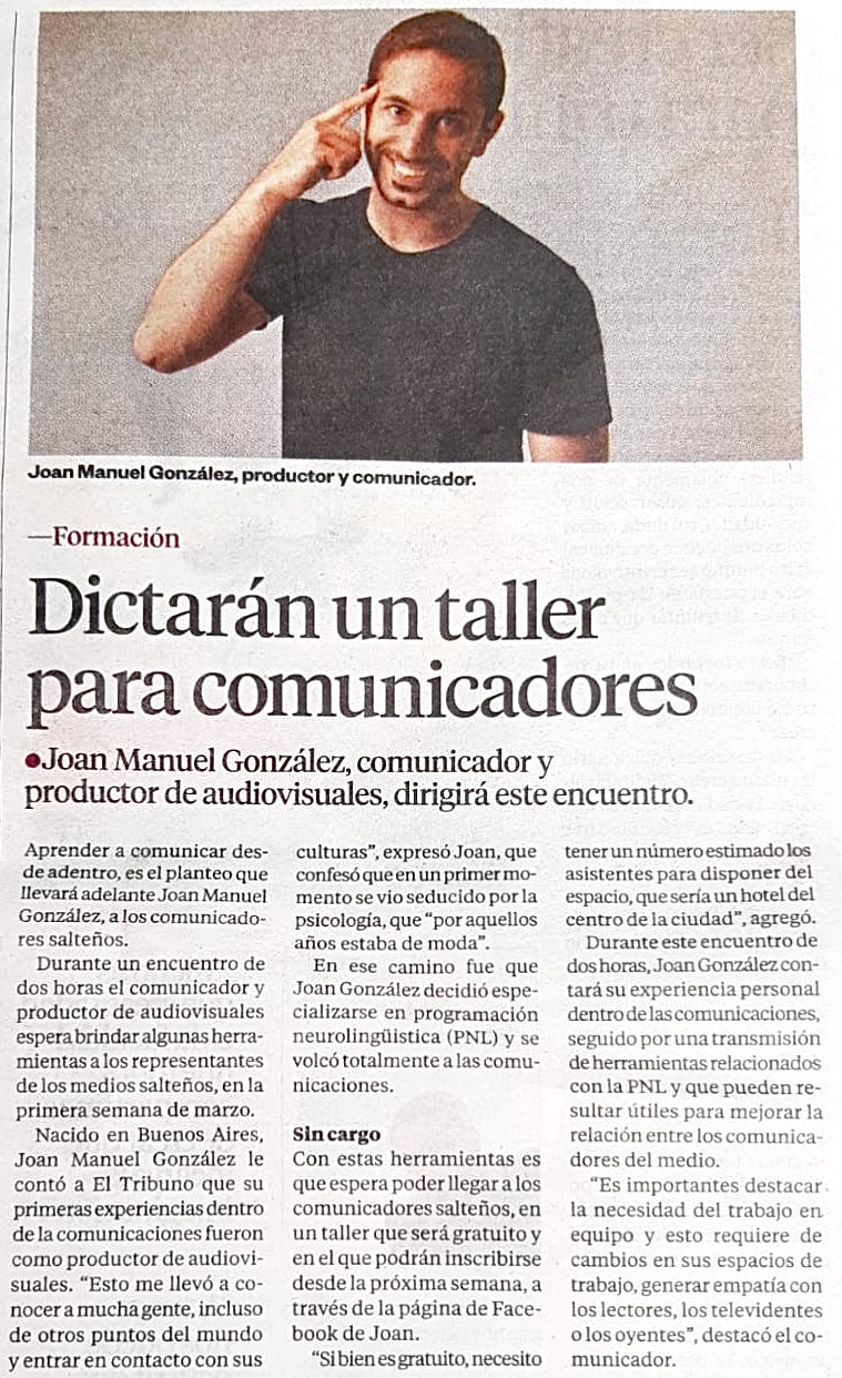 CANAL 2 - Musicalizan2 CANAL MILENIUM - A media mañana FM CIUDAD 103.9 - Noticias FM LA 90.9 - Detonados y Más PERIODICO - El Tribuno PORTAL DIGITAL - Nova y Todo salta PROD. AUDIOVISUAL - Alejandro Gomez RADIO 10 - La noche de Natal CONEXION ABIERTA - Nehuen Rubio